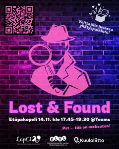 Kuuloliitto, LapCI ry ja KLVL ry järjestävät n. 13-17-vuotiaille kuulovammaisille nuorille etäpakopeli-illan pe 14.11. klo 17.45-19.30 Microsoft Teams -sovelluksen kautta. Pelaamamme pakopeli on Lost & Found: pelissä tullaan jakamaan osallistujat muutamaan eri tiimiin, ja tiimien tehtävänä on selvittää niin monta kadonneen ihmisen tapausta tunnin sisällä kuin kerkeävät. Kun tunti on päättynyt, parhaiten suoriutunut tiimi tulee saamaan palkinnoksi herkkuja ja leffalippuja. Tapahtuma on maksuton.